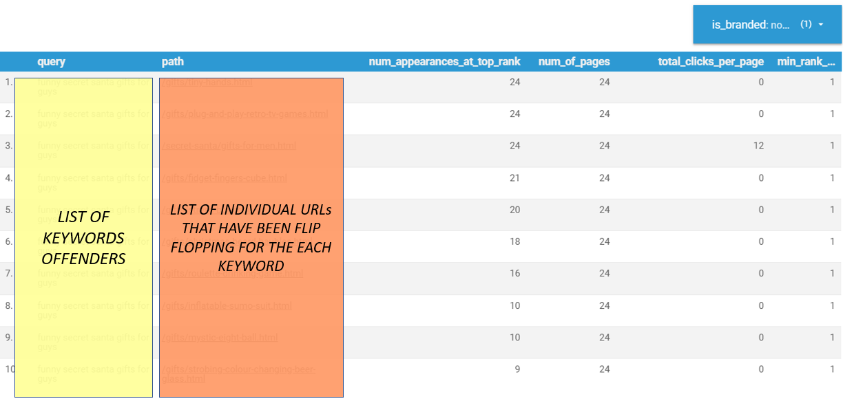 The table above captures the full list of keyword offenders for the period of time selected. For instance, keyword 'X' at the top of the table has generated 13 organic clicks (total_clicks) from GSC over the period considered and changed ranking URL approximately 24 times (num_of_pages).